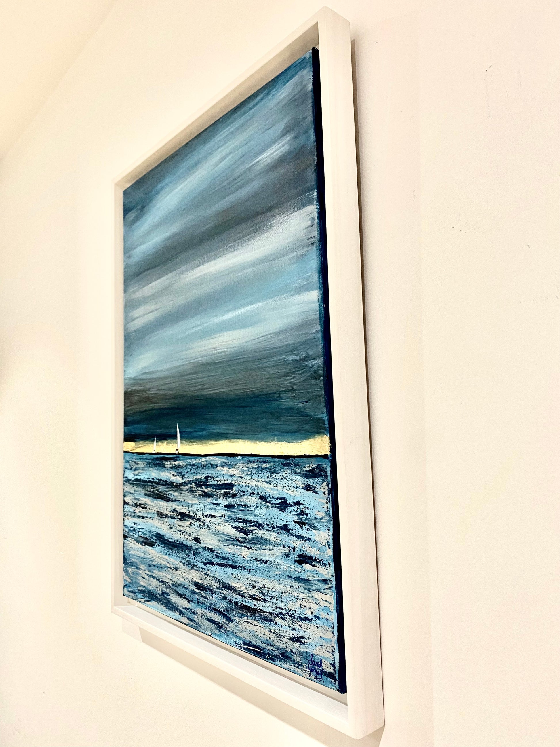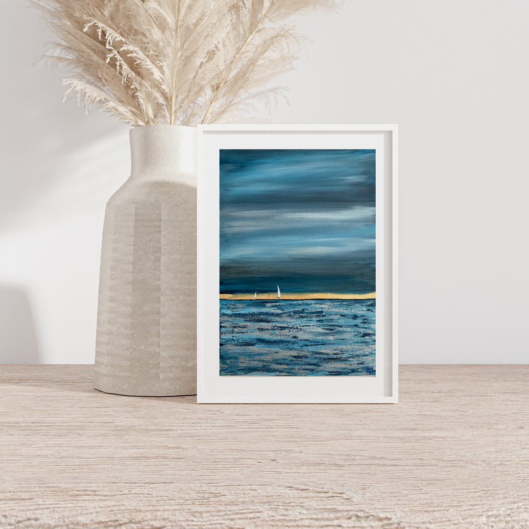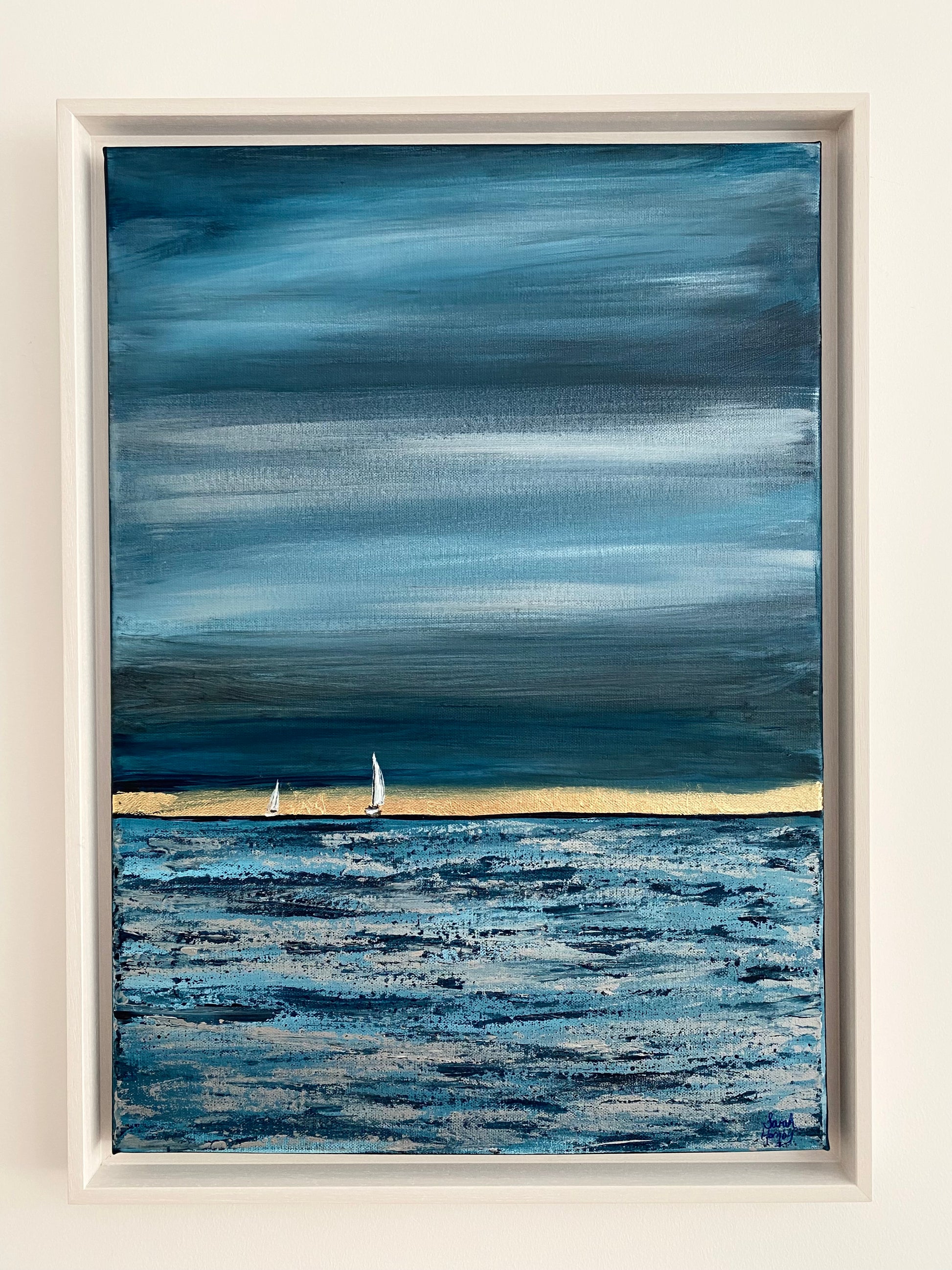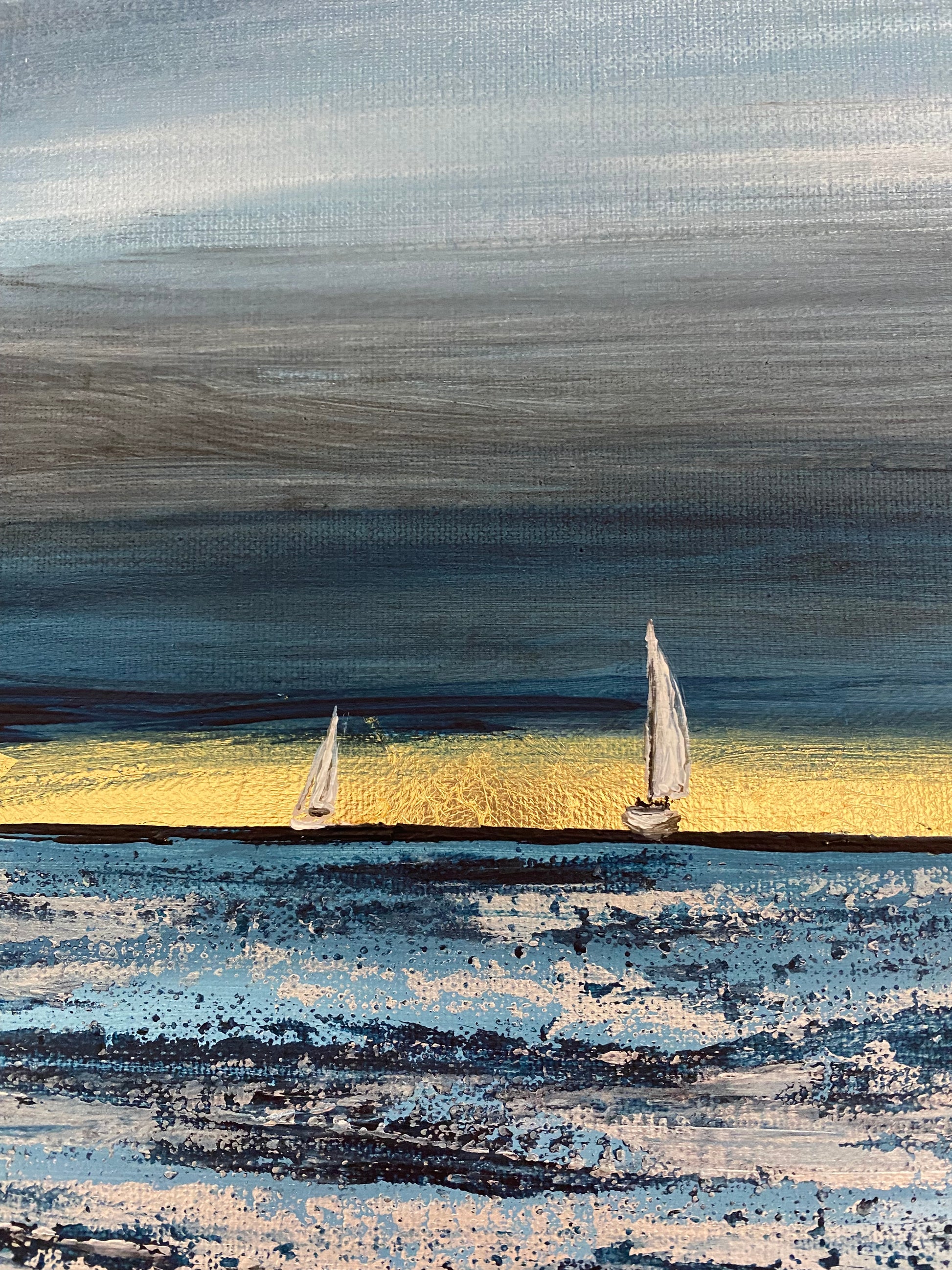 Original art work featuring the view from Sandbanks as two boats sail across Poole Bay. Original painting on canvas using acrylic and gold leaf.